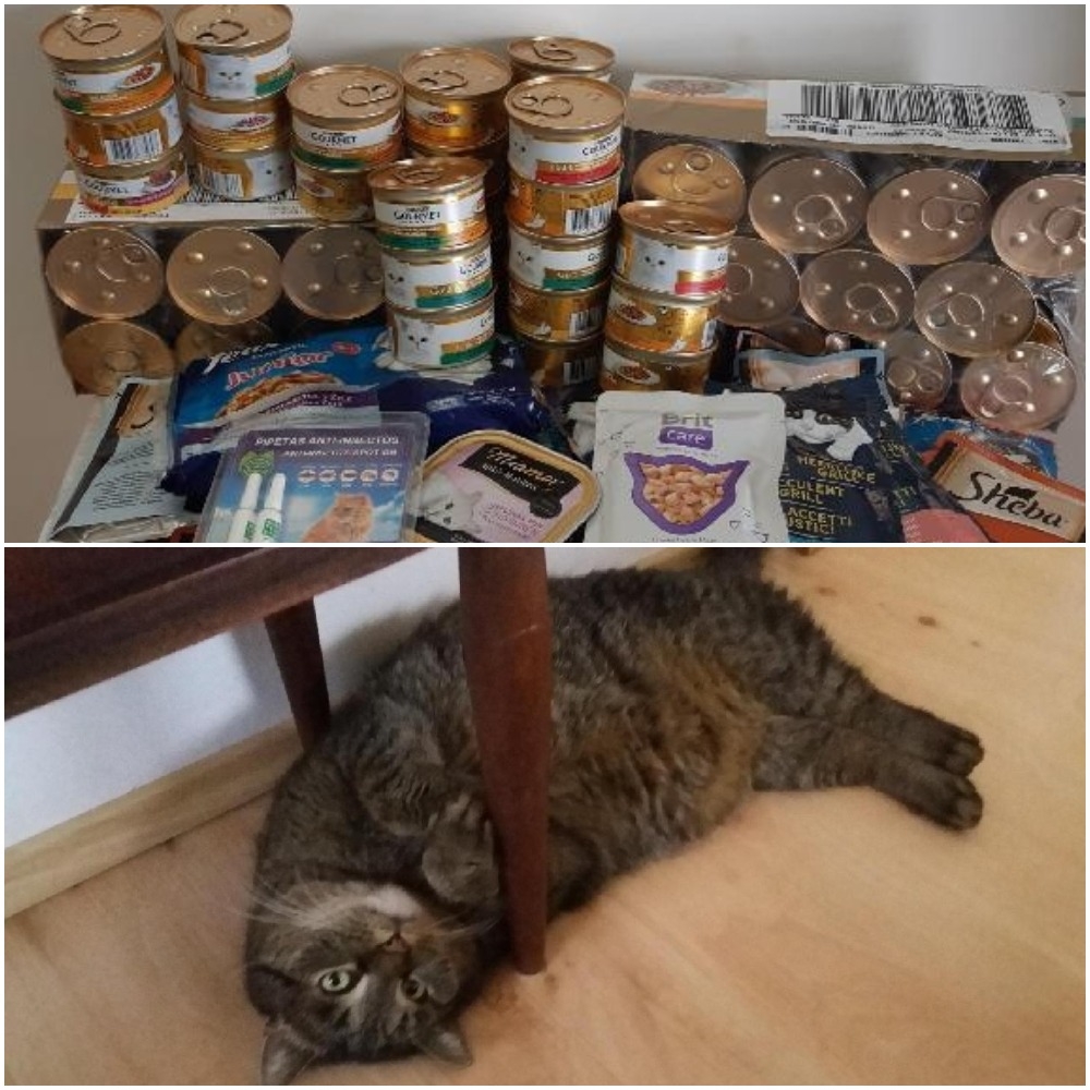 Děkujeme za dobroty pro kočky v naší péči. Bednu kapsiček a konzerviček nám opět poslala paní Zapletalová se svým kocourem Cyrilem ze Cvrčovic. Jako důkaz, že se o kocoura dobře stará, nám poslala i jeho fotku. Obviňovali jsme ji totiž, že ho mučí hladem jen proto, aby nám mohla poslat nějaké krmení. Uznáváme, že Cyril nevypadá jako někdo, kdo trpí. Natož hladem. :-)