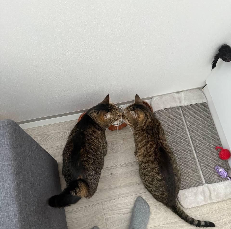 Takhle to vypadalo v červenci v novém domově kočičky Audrey. Stěhovala se tam na konci června ke staršímu Mourkovi a tohle bylo prý první letmé ťuknutí, které si společně dopřáli. Věříme, že teď už jsou ve vzájemném oťukávání určitě mnohem dál.