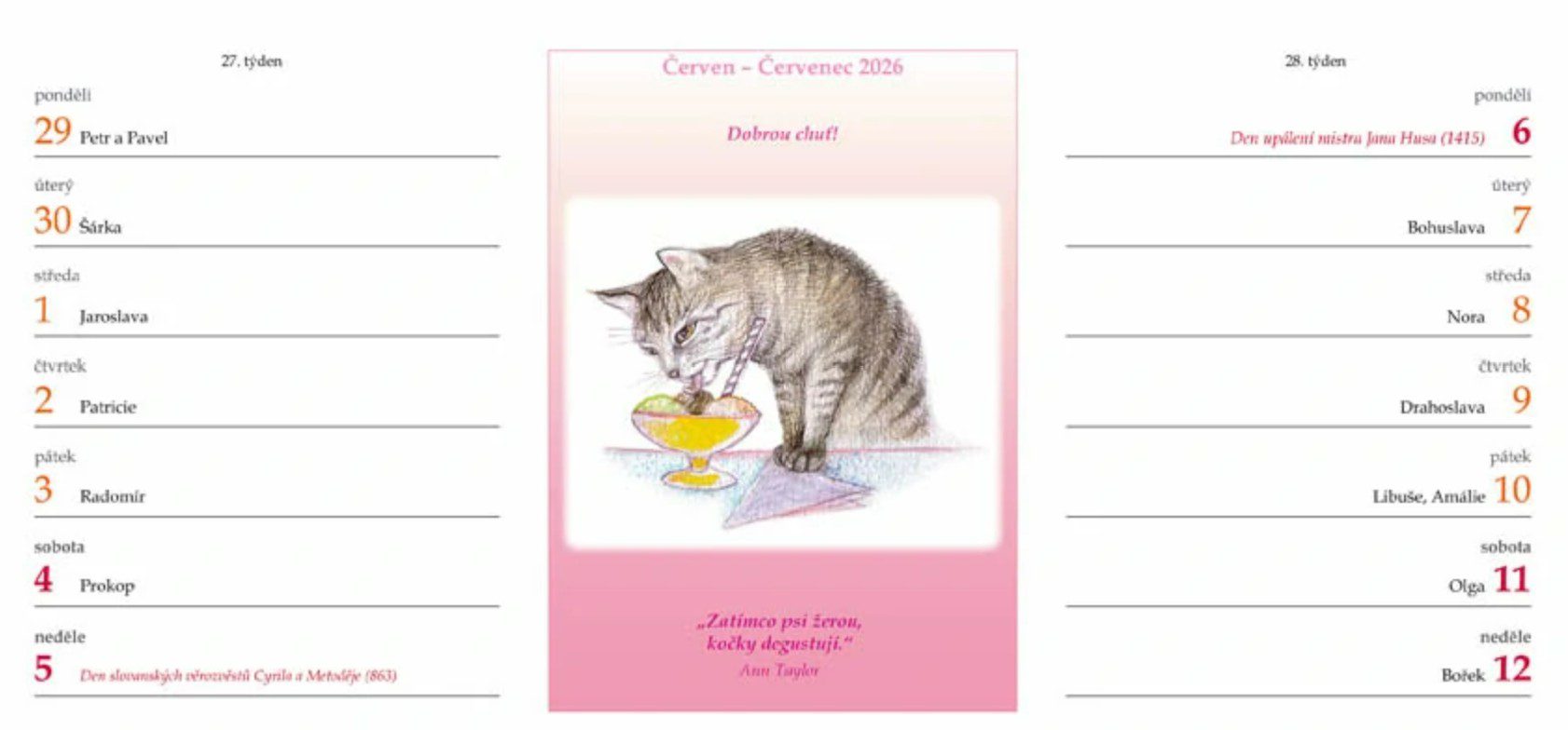 Čtrnáctidenní stolní kalendář 2026 – Na růžích ustláno (s kočičími citáty)